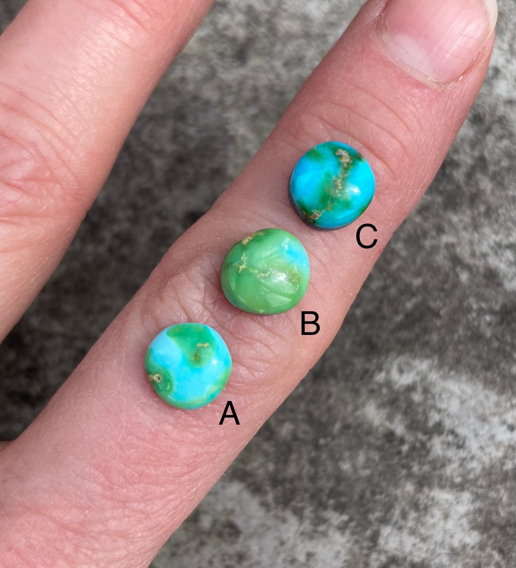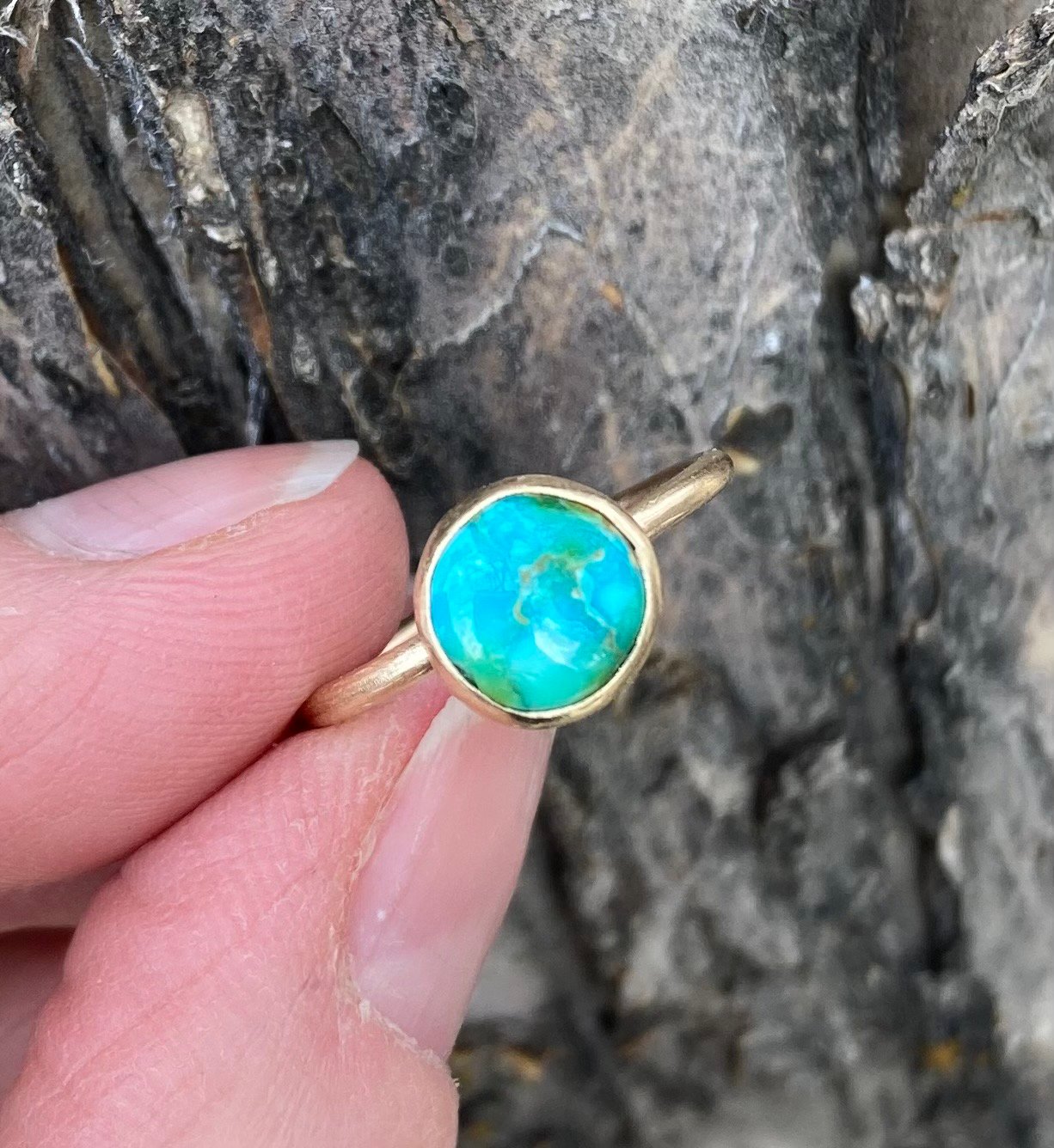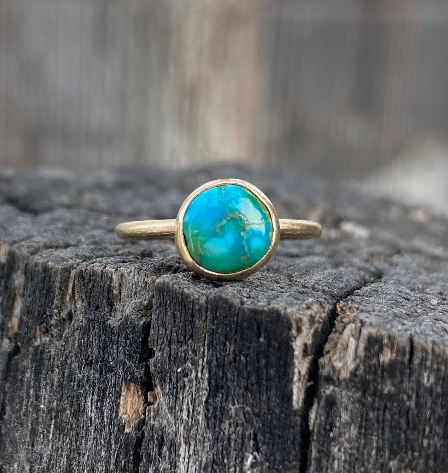 Your choice of turquoise will be set in 14K solid yellow gold in your selected size. Please provide your size in a message during checkout, quarter and half sizes are no problem! I will reach out to confirm your size.